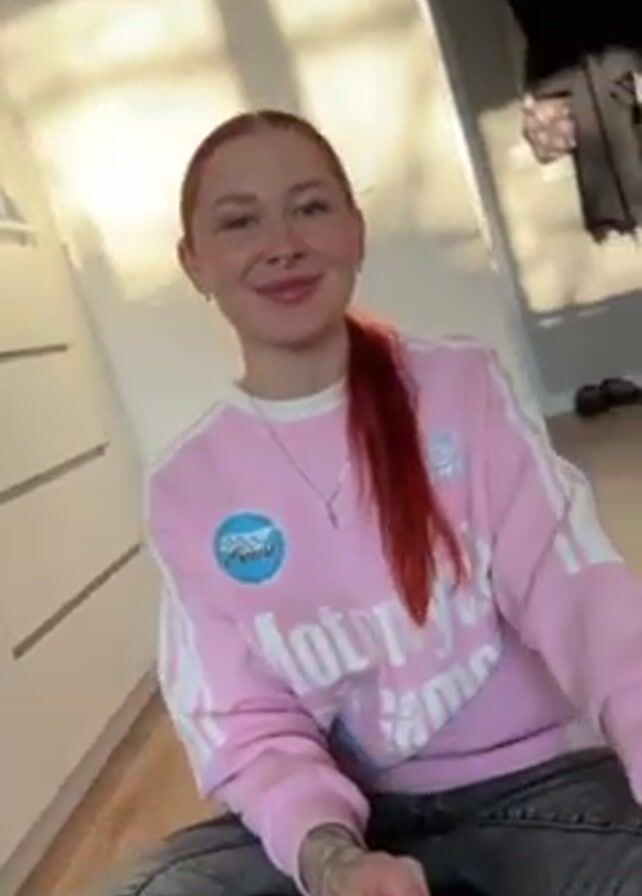 A young woman with red hair pulled into a ponytail is sitting cross-legged on a wooden floor. She is holding a selfie stick and filming herself. She is wearing a pink sweatshirt with white stripes on the sleeves and a logo on the chest, and gray jeans. She has a silver necklace with a cross pendant and a nose ring. She smiles and moves the selfie stick around, showing the room. The room appears to be a bedroom or living space with white walls, a white dresser, and a partial view into another room. Sunlight is streaming in from a window.