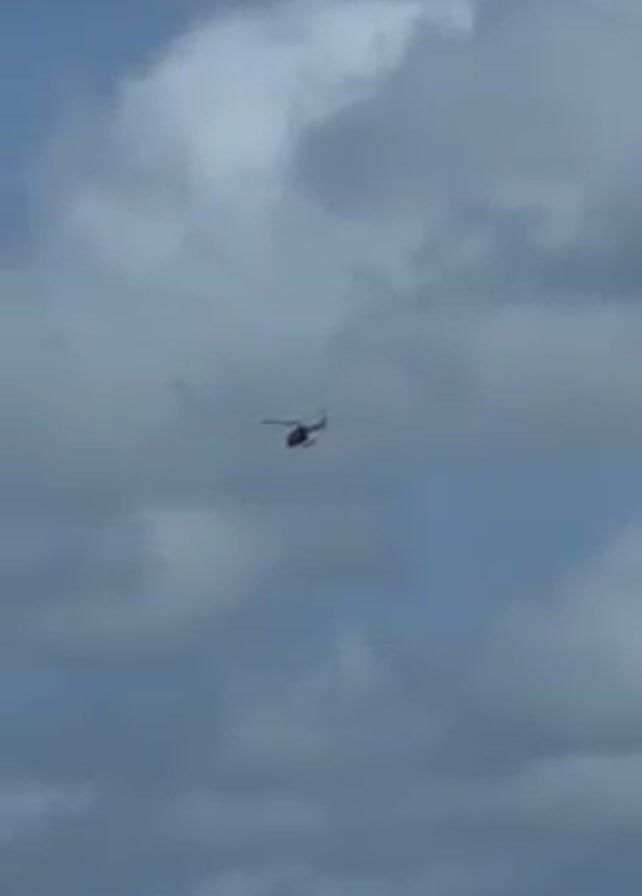 A helicopter, red with a gray tail, is flying in a cloudy, blue sky. The helicopter appears to be distant, seen in full from below, against a backdrop of a mix of light and dark gray clouds.