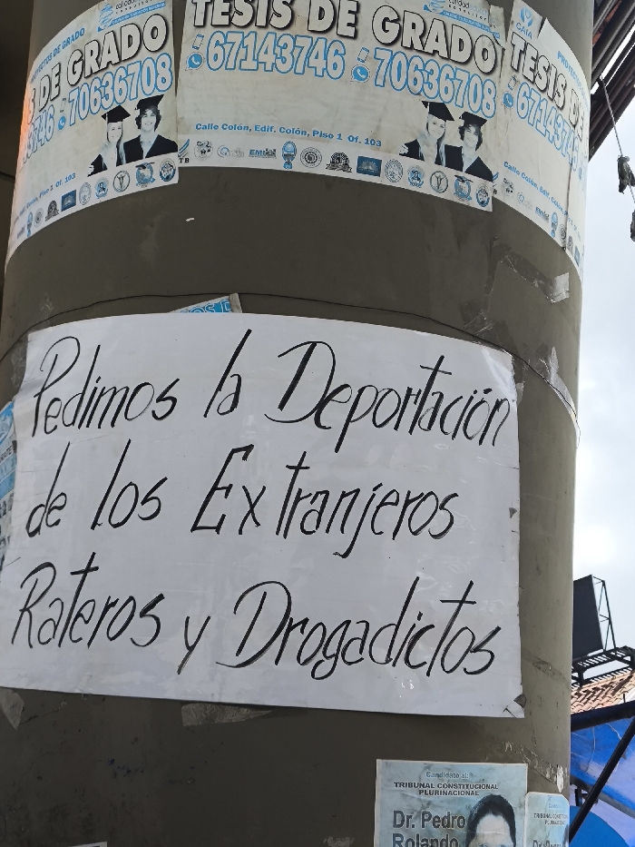 A light gray utility pole is plastered with several signs. At the top, "TESIS DE GRADO" is prominently displayed on two nearly identical posters with phone numbers "67143746" and "70636708". Further down, a handwritten sign demands "Pedimos la Deportación de los Extranjeros Rateros y Drogadictos," which translates to "We ask for the deportation of foreign thieves and drug addicts." Below this, a poster promotes a political candidate, "Dr. Pedro Rolando", for the Tribunal Constitucional Plurinacional.