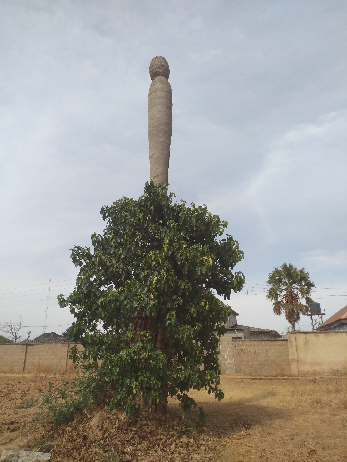 The image depicts an outdoor scene in Narayi, Nigeria, under an overcast sky. In the foreground, a large, leafy tree with dense green foliage dominates the left and central view, its base rooted in dry, light brown soil with scattered fallen leaves. Directly behind and partially obscured by the tree's canopy, a tall, slender, light grey concrete pillar-like structure rises prominently. This structure tapers slightly as it ascends and is topped with a distinct bulbous, segmented cap. In the midground, a light-colored, unpainted concrete block wall acts as a boundary, extending horizontally. Behind this wall, the roofs of several buildings are visible. To the right, a section of a light yellow plastered wall is present, behind which stands a palm tree with green fronds and clusters of reddish-brown fruit. A black metal water tank on a stand is partially visible behind the palm tree. Faint utility lines cross the upper midground. No individuals, discernible actions, or interactions are visible within the scene.