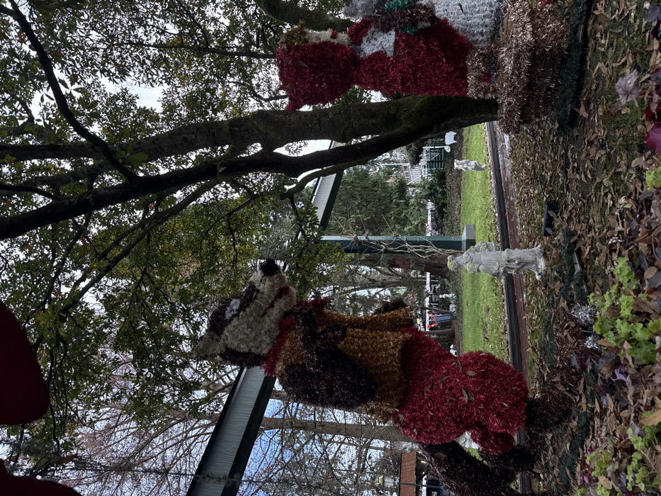 The scene depicts an outdoor decorative display, likely within Europa-Park, Rust, Germany, under an overcast sky. In the foreground, two large, bipedal figures constructed from tinsel-like material are positioned on ground covered with brown and green foliage. To the left, a wolf-like figure stands, facing right. It features a light brown and white head with visible eyes and a red collar. Its upper body is composed of dark brown and light brown tinsel, while its lower body and tail are red tinsel. To the right, partially obscured by a tree, stands a second figure, resembling Little Red Riding Hood, in a red tinsel cloak and white tinsel elements, facing left towards the wolf. A brown tinsel basket-like object rests at its base. Between these two figures, a white, weathered statue of a robed female figure is visible. Further back, a smaller, slender white statue stands. A narrow, dark-colored track runs horizontally across the mid-ground. The background features numerous trees, some with green leaves and others bare, suggesting a cool season. An elevated light-green track structure for a ride or monorail spans the upper-left, and various park elements, including additional white animal statues (e.g., sheep) and white architectural structures, are visible throughout the deeper background.