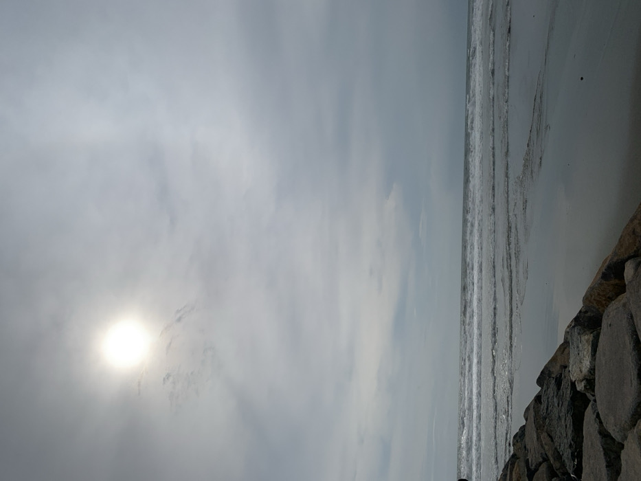 This image depicts a coastal scene on a cloudy day in Kuta, Indonesia. The sky occupies the upper two-thirds of the frame, characterized by extensive grey cloud cover. A bright, circular sun is visible in the upper left quadrant, partially obscured by the clouds, creating a strong glare. The ocean fills the middle ground, displaying multiple parallel lines of breaking waves receding towards the shore. The water surface appears dark and reflective under the overcast sky. In the foreground, specifically the bottom left, a collection of large, irregular rocks forms a partial breakwater or coastal embankment. The sandy beach in the immediate foreground is wet, reflecting the sky and showing minor ripples from the receding tide. No individuals or active subjects are discernible within the frame.