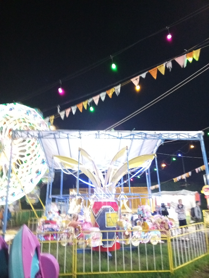 - "A colorful carnival ride at night features a central structure with yellow and white awnings, surrounded by seats with colorful embellishments" by FM-i924p2, licensed under CC BY 4.0