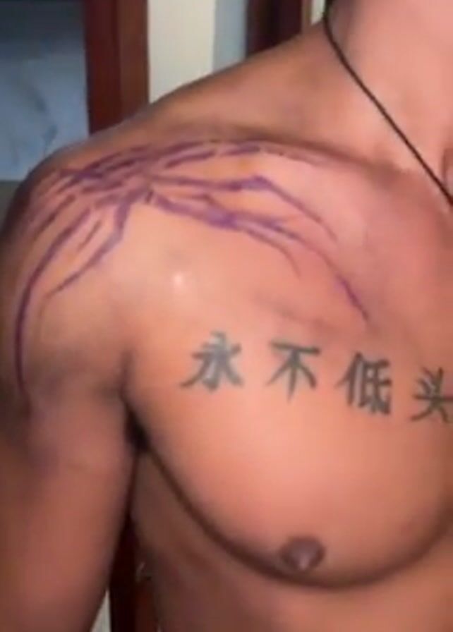 A shirtless man stands indoors, showing a purple, sketchy design on his right shoulder