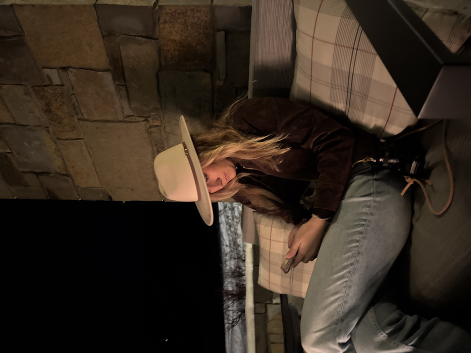 A woman with long blonde hair, wearing a white cowboy hat, brown jacket, and light blue jeans, is sitting on a patterned couch. She is looking down and holding a mobile phone in her hand. There is a stone wall behind her, and a dark, possibly outdoor, area is visible on the left. A camera is attached to her belt. The image appears to be taken in low light, possibly at dusk or at night.
