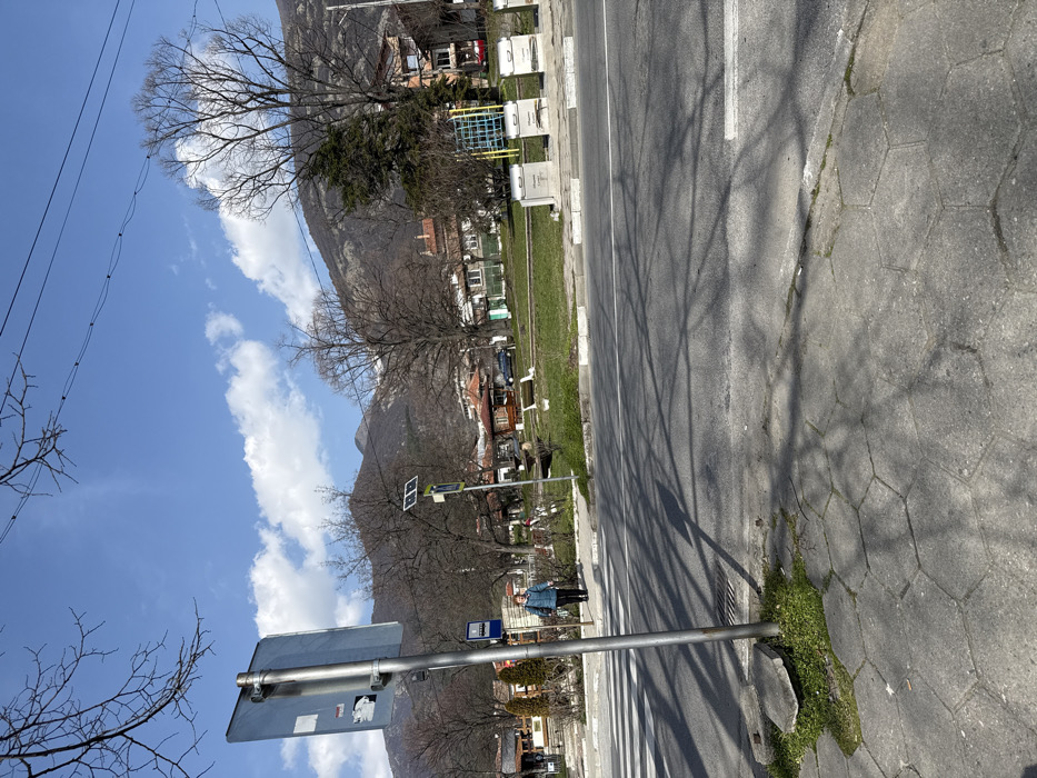 The image depicts an outdoor scene in Sopot, Bulgaria, on a clear, sunny day, likely during late winter or early spring due to bare deciduous trees. In the immediate foreground, a grey hexagonal paver sidewalk is visible, with a metal pole supporting the rear of a rectangular sign, its face obscured. Sparse green grass grows around the base of the pole. Long, distinct shadows of tree branches are cast across the sidewalk and the adjacent asphalt road, which features a double white center line and a single white line near the curb. In the midground, a female individual, appearing to be an adult, walks from left to right across a designated zebra pedestrian crossing on the asphalt road. She is dressed in a light blue jacket and dark trousers. Behind her, to the left, a blue and white bus stop sign is visible. A grassy median separates the road from a row of buildings and trees further back. Within this median, a pole with a solar panel array is visible, alongside several bare trees and patches of green grass. Three white rectangular recycling bins, each with a sloped top, are situated along the curb of this median. A dark-colored car is parked on the far side of the street, partially obscured by trees. Various buildings with red-tiled roofs are scattered behind the trees. The background is dominated by large, dark-colored mountains under a bright blue sky with scattered white cumulus clouds. Overhead, thin power lines are visible against the sky.