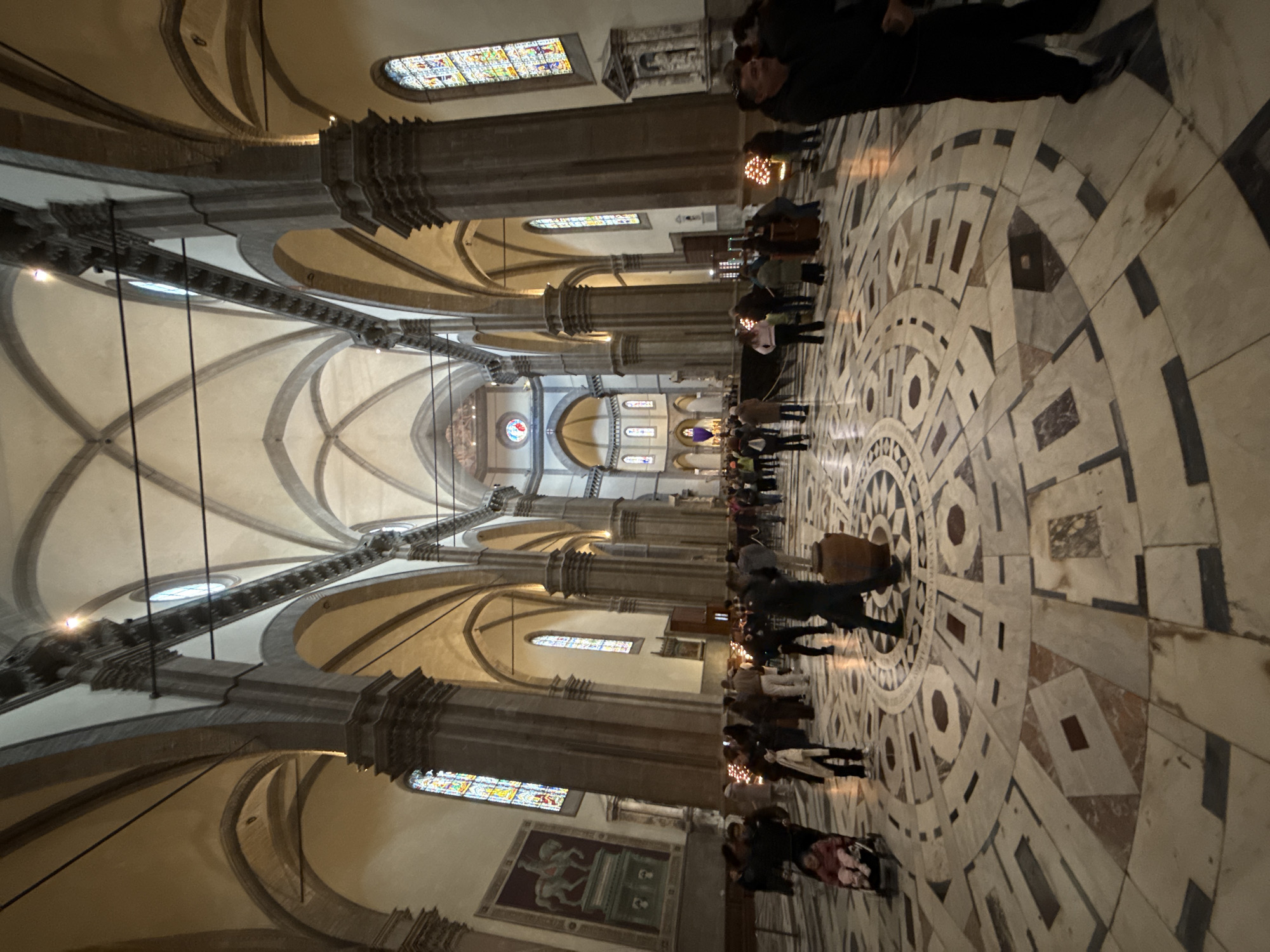 The image displays the vast interior of the Cattedrale di Santa Maria del Fiore (Duomo) in Florence, Italy. The perspective is from the nave, looking towards the high altar and the dome. The environment is characterized by towering stone columns with elaborate capitals, supporting a high, ribbed vaulted ceiling. Numerous arches define the architectural structure. Stained-glass windows, featuring multi-colored patterns, are visible along the walls, providing natural light. The floor is an intricate mosaic of polished marble, composed of various shapes and colors arranged in geometric patterns, including a prominent large circular medallion in the central foreground. Approximately 50 to 70 individuals, primarily adults, are present, dispersed throughout the nave. They are mostly standing or walking, appearing to be visitors or tourists. Many are dressed in winter attire. On the left side, a large fresco depicting an equestrian monument of a knight on horseback is visible on the wall, above a section of stained glass. Below this, a person pushes a stroller containing a child. In the mid-ground, a large earthenware pot rests directly on the marble floor. In the far distance, the architectural details of the dome and the high altar area are discernible, with a distinct purple banner or cloth hanging centrally. Thin, dark cables or wires are visible traversing the upper sections of the nave. Small, lit decorative elements are placed near some columns on the right. The overall scene depicts a public space within a historic religious building, with visitors observing their surroundings.