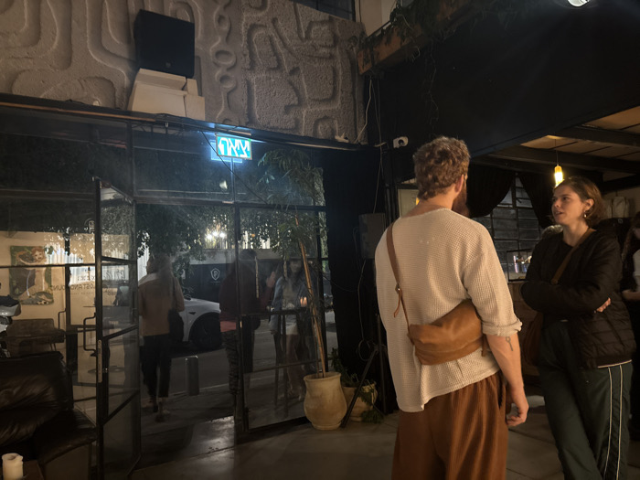 A nighttime scene shows two people conversing outdoors near a building. One, seen from the back, has curly hair, a white waffle-knit shirt, brown pants, and a brown leather bag. The other, facing them, wears a dark jacket and striped pants. Behind them is a building with a glass entrance, reflecting cars and people. A lit exit sign is visible above the doorway. The building's façade features a textured wall and a large speaker mounted high up. Potted plants add a touch of greenery to the scene.