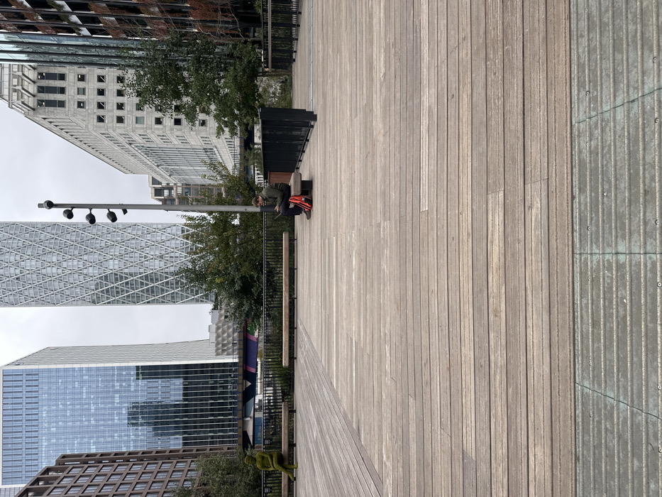 The image displays an outdoor pedestrian area, identified as Jubilee Park in Canary Wharf, London, United Kingdom, under an overcast sky. The foreground features a wide expanse of light brown wooden decking, composed of horizontally and diagonally laid planks. The bottom edge of the frame reveals a section of dark grey, ridged metallic paving. In the midground, a green foliage sculpture of a seated female figure rests on a light brown wooden bench on the left. To the right, a man is seated on an identical wooden bench. He wears a dark green jacket and dark trousers, and is observed looking down at a small electronic device held in his hands. An orange backpack lies on the ground next to his right foot. Several other identical empty wooden benches are spaced across the decking. A black metal railing runs along the right side of the elevated decking, bordering a lower section with green foliage. A grey pole, equipped with four circular light fixtures, stands behind the seated man. The background is characterized by modern high-rise architecture. From left to right, a tall skyscraper with a blue-tinted reflective glass facade is visible. Adjacent to it, a taller, slender skyscraper with a prominent white diagonal grid pattern on its exterior dominates the skyline. To the right of this, a multi-story building with a light grey, likely concrete or stone, facade featuring numerous rectangular windows is present. Further to the right, a building with a reddish-brown facade and green elements is partially visible. An elevated concrete structure, possibly a bridge or pathway, is situated beneath the central skyscrapers.