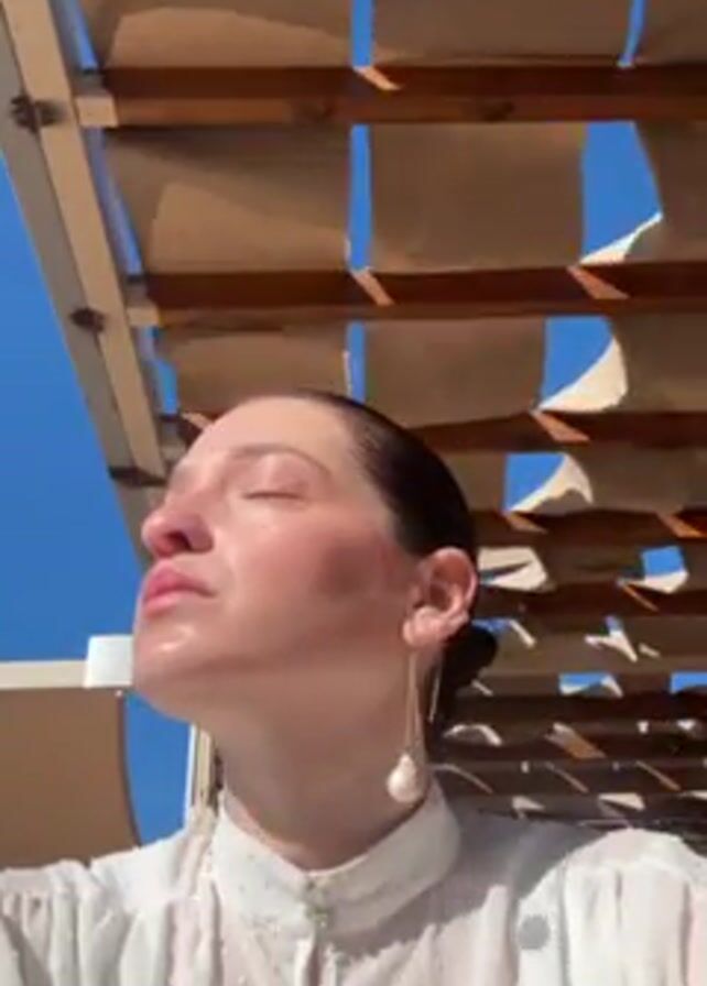 A woman is looking up, her face in the sunlight. She has fair skin, and her hair is pulled back. She is wearing a white, semi-sheer blouse with a high collar, and she has a dangling pearl earring. She is standing under a pergola-like structure with a slatted wooden frame and fabric panels that provide some shade. The sky is blue.