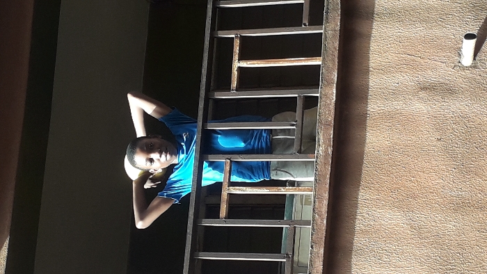 A young individual, appearing to be a male child or adolescent with dark skin and short dark hair, stands on a balcony in Onitsha, Nigeria, looking directly at the camera. The individual wears a blue short-sleeved t-shirt and light-colored shorts. Their arms are raised, and hands are clasped behind the head, holding a light-colored, possibly yellow, spherical object. A dark metal railing with vertical and horizontal bars, showing signs of wear and rust on some vertical sections, is positioned in front of the individual, obscuring the lower torso and legs. Behind the railing, a light-colored rectangular object, possibly an air conditioning unit or window, is visible to the viewer's left. The background directly behind the individual is a dark, shaded interior or recessed area. Below the railing, a textured, light brown stucco wall is visible, capped by a reddish-brown ledge. A white cylindrical pipe protrudes horizontally from the lower right portion of this wall. The scene is illuminated by strong directional sunlight from the upper right, casting shadows and highlighting the left side of the individual and portions of the railing and wall.
