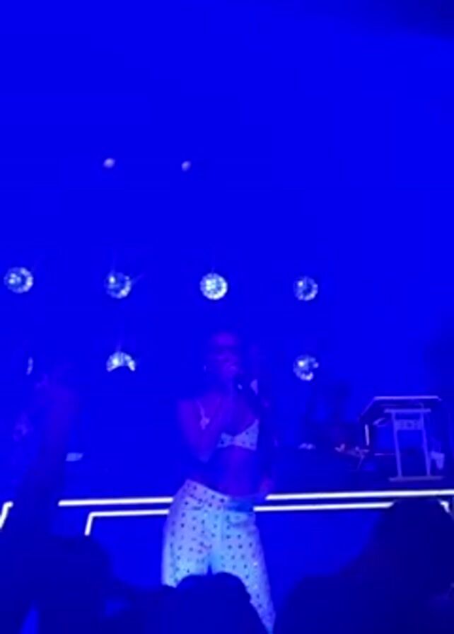 The video depicts a woman singing on a stage bathed in blue light. She is wearing a white bra-style top with matching pants. Behind her are several disco-ball-style lights and a few blurred figures who appear to be playing instruments. In front of the stage, several audience members have their hands raised in the air, obscuring part of the view. The stage itself is outlined with white LED lights.