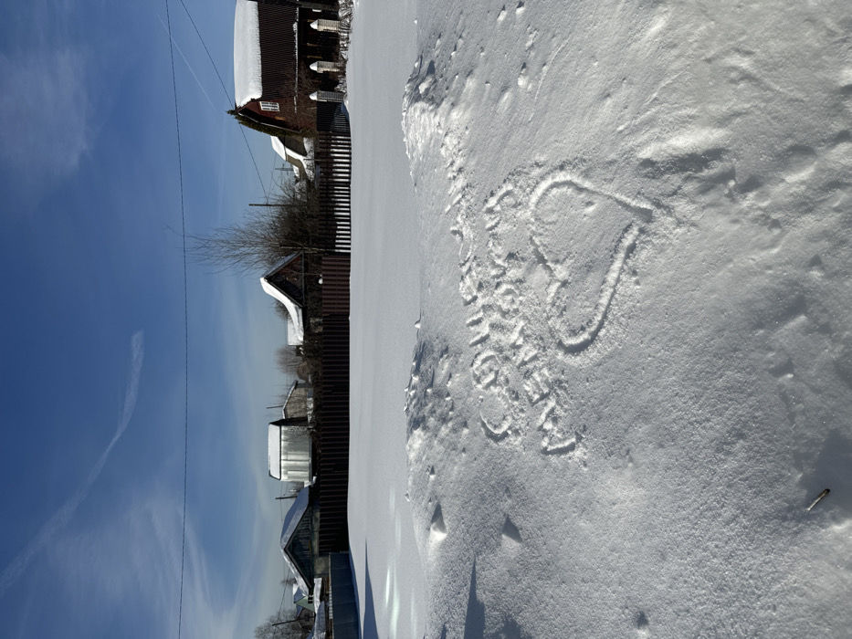 The image depicts a winter scene in the city of Pokrov, Russia, under a clear blue sky with a few faint white contrails. The ground in the foreground is entirely covered in undisturbed white snow, forming a gentle undulation. Etched into the snow in the lower-mid foreground are Cyrillic letters forming the phrase "С ДНЁМ ВЛЮБЛЕННЫХ!" (Happy Valentine's Day!), positioned above a distinct heart shape also traced into the snow. In the midground, a dark brown, corrugated metal fence with vertical panels runs horizontally, separating the snowy foreground from the background structures. Behind the fence, from left to right, are several buildings characteristic of a residential or semi-rural area. These include a dilapidated wooden building with a snow-covered gabled roof, a tall, narrow, light-colored shed or utility structure with a rounded roof, and another wooden house with a steep, snow-laden gabled roof and exposed bare tree branches around it. To the far right, a larger, two-story house with a dark, steep roof heavily covered in snow is visible, featuring a rectangular window on its upper floor and light-colored decorative elements near the roofline and at the base of the fence. Utility lines are visible traversing the sky above the fence line. No individuals are present in the scene.