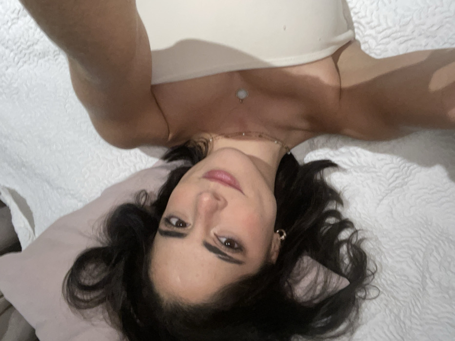 A woman lies on a bed with a white textured bedspread and a pink pillow. She wears a white top, a beaded necklace, and earrings. Her dark hair frames her face, and she gazes directly at the camera with a slight smile. The selfie-style shot offers an intimate and close-up view, focusing primarily on her face and upper body. The image appears to be taken indoors with natural lighting.
