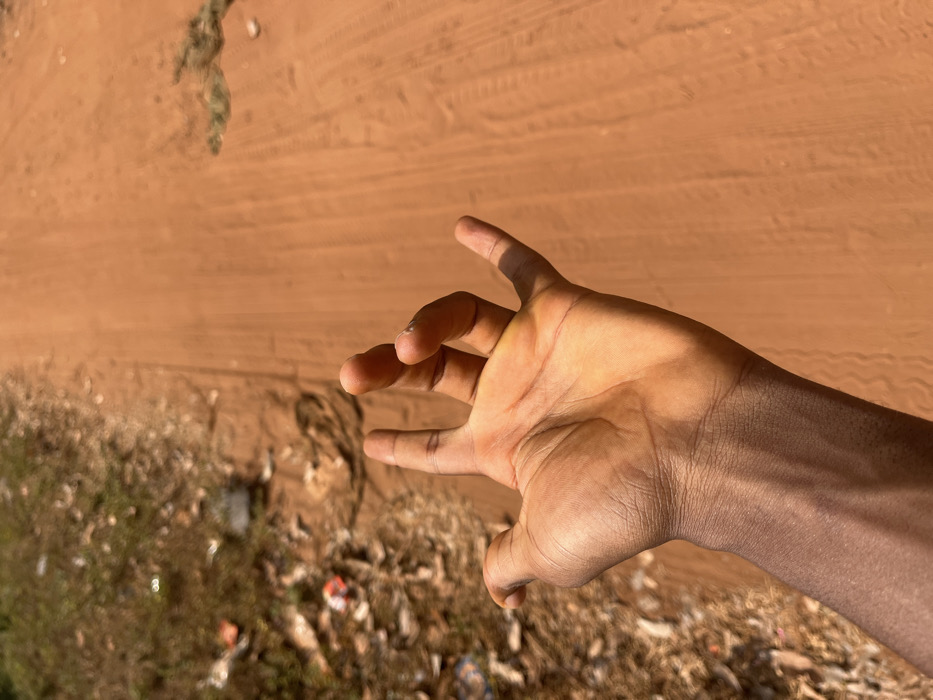 A close-up, high-angle photograph depicts a dark-skinned human left forearm and hand, extended forward and slightly upward, with fingers partially splayed. The palm, facing slightly towards the viewer, exhibits a lighter yellowish-brown hue compared to the darker skin of the forearm and dorsal hand. Visible superficial veins are present on the forearm. The scene is outdoors in Idah, Nigeria. The background reveals a reddish-brown dirt road to the right, showing distinct parallel tire tracks or grooves. To the left of the road, a strip of ground features sparse, dry green vegetation mixed with scattered refuse, including what appears to be plastic debris and dry leaves. Strong, direct natural sunlight illuminates the scene, casting sharp shadows and highlighting surface textures.