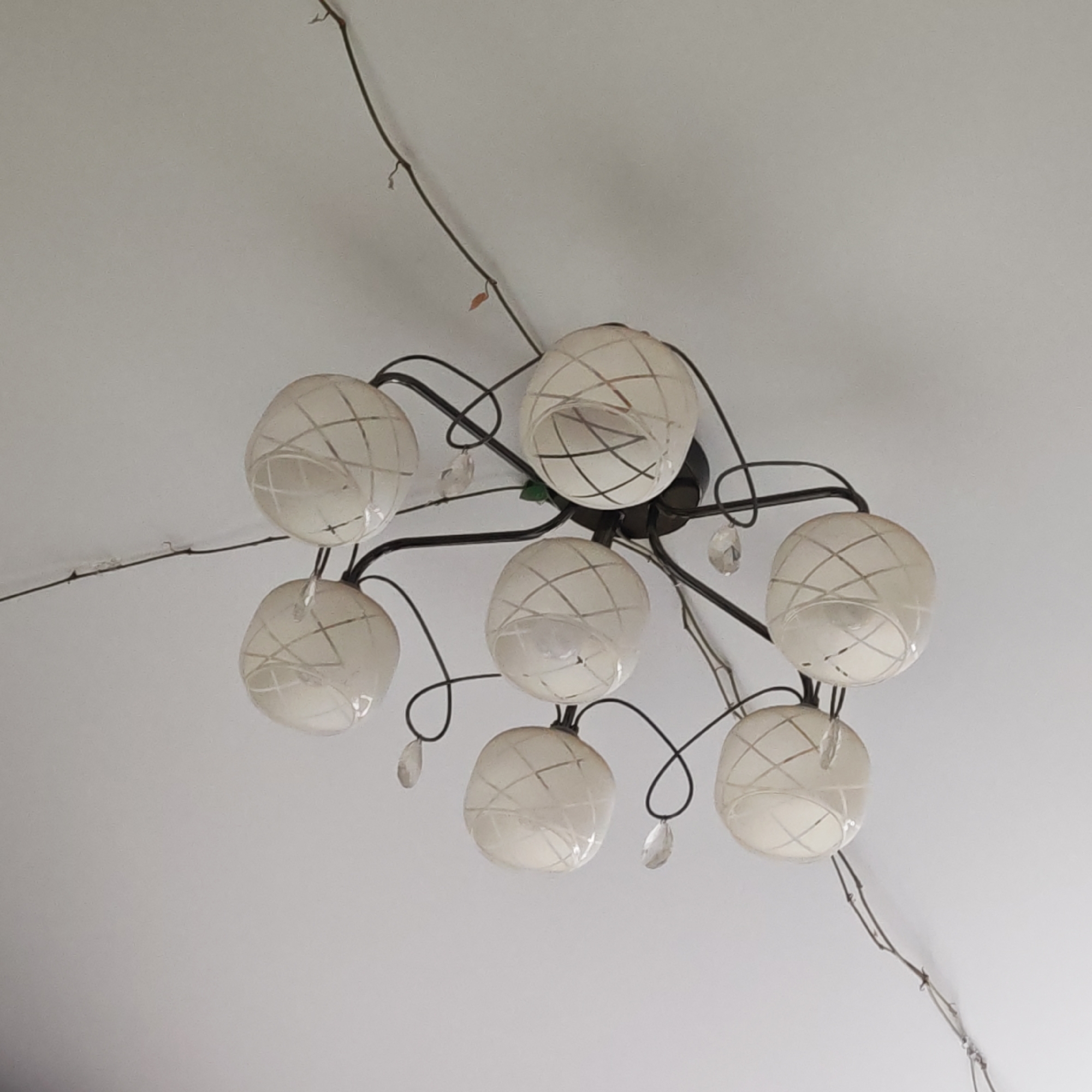 - "A chandelier with seven globe-shaped, white-tinted glass shades hangs from a white ceiling" by FM-cLarj2, licensed under CC BY 4.0
