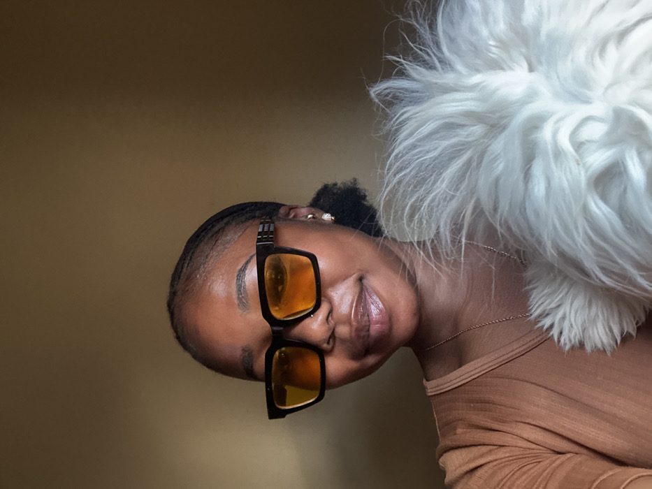 A young adult female, with a dark complexion and dark hair styled in small braids or cornrows pulled back, is depicted from the chest up indoors. She wears rectangular-framed sunglasses with thick black frames and yellow-orange tinted lenses, featuring ridged detailing on the temples. Her lips are full and appear glossy, and a small stud is visible in her left nostril. She wears a brown or terracotta-colored ribbed v-neck top, a thin gold-colored chain necklace, and a light-colored stud earring on her visible right ear. A large, white, fluffy object, consistent with faux fur, rests against her left shoulder and chest, partially obscuring her body. The background is a plain, solid light brown wall. The scene is located in the city of Jos, Nigeria.
