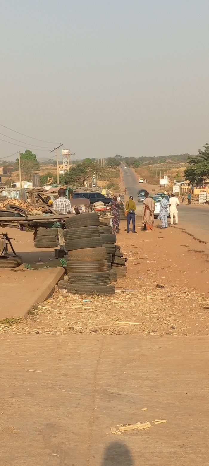 An outdoor scene shows people gathered near a road with vehicles in the distance. A stack of tires and a small market are in the foreground. The overall environment appears dry, with an earth-toned color scheme. A tower is visible on the horizon. The sky is hazy, suggesting the scene is taken during daylight hours.