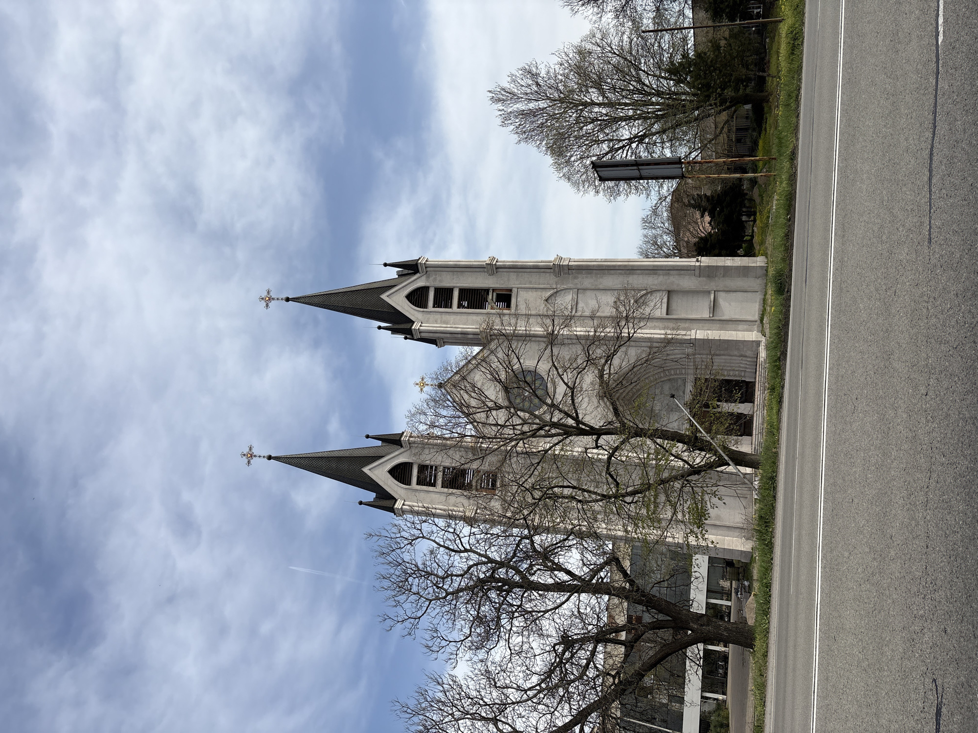 - "A low-angle, slightly vertical view captures a building featuring two symmetrical towers, each topped with a cross, standing against a sky filled with white clouds on a clear day" by FM-2RVs73, licensed under CC BY 4.0