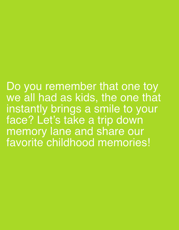 The scene, presented as being located in Marinka, Bulgaria, is a static digital graphic. It features a uniform, solid lime green background that occupies the entire frame. White, sans-serif text is positioned in the lower portion of the frame, left-aligned within its block. The text reads: "Do you remember that one toy we all had as kids, the one that instantly brings a smile to your face? Let's take a trip down memory lane and share our favorite childhood memories!". There are no people, physical objects, discernible actions, or direct interactions depicted within the image. The environment is entirely conceptual, consisting of this two-dimensional text and colored background.