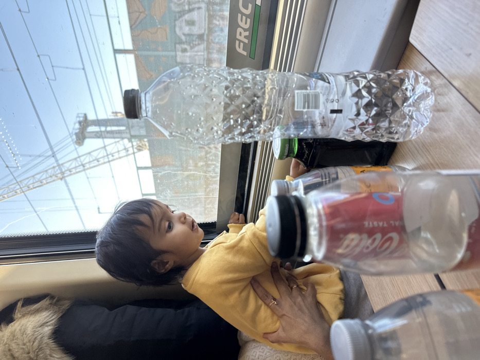 The scene depicts the interior of an Italian Frecciarossa high-speed train, with a view through a window onto an urban-industrial landscape, consistent with approaches to a major city like Florence, Italy. **People:** A young child, appearing to be an infant or toddler with dark hair and a light brown complexion, wears a mustard yellow long-sleeved top. The child is positioned at the window, gazing intently outwards and slightly downwards, with their right hand resting on the window frame. An adult's left hand, adorned with two rings (a plain band and one with a small stone), is visible supporting the child's lower back/waist area from the left. A portion of a dark jacket with a fur-lined hood, belonging to the adult, is partially visible behind the child. **Objects (Interior):** A light-colored, possibly wooden or laminate, table runs parallel to the window. On the table, from left to right in the foreground, are: a blurry clear plastic bottle with a white cap, partially filled; a clear plastic Coca-Cola bottle with a red label (displaying "Coca-Cola ORIGINAL TASTE") and a black screw cap, appearing mostly empty; another clear plastic bottle with an orange label and white cap; a dark plastic bottle with a green screw cap; and a prominent, partially filled clear plastic water bottle with a textured, diamond-patterned exterior, a black screw cap, and a white barcode label visible on its side. The green "FRECCIA" logo, indicative of the "Frecciarossa" train brand, is visible on the grey train interior panel below the window. **Environment (Exterior):** Outside the train window, a clear blue sky is visible, traversed by numerous overhead power lines (catenary system). In the mid-ground, a large yellow construction crane dominates the upper left, while a tall, grey concrete cylindrical structure stands further back to the right of the crane. Below these structures, a grey concrete wall or barrier is visible, adorned with faded graffiti or painted designs, including partial letters resembling "RA." The exterior scene is characteristic of railway infrastructure and an urban peripheral zone.