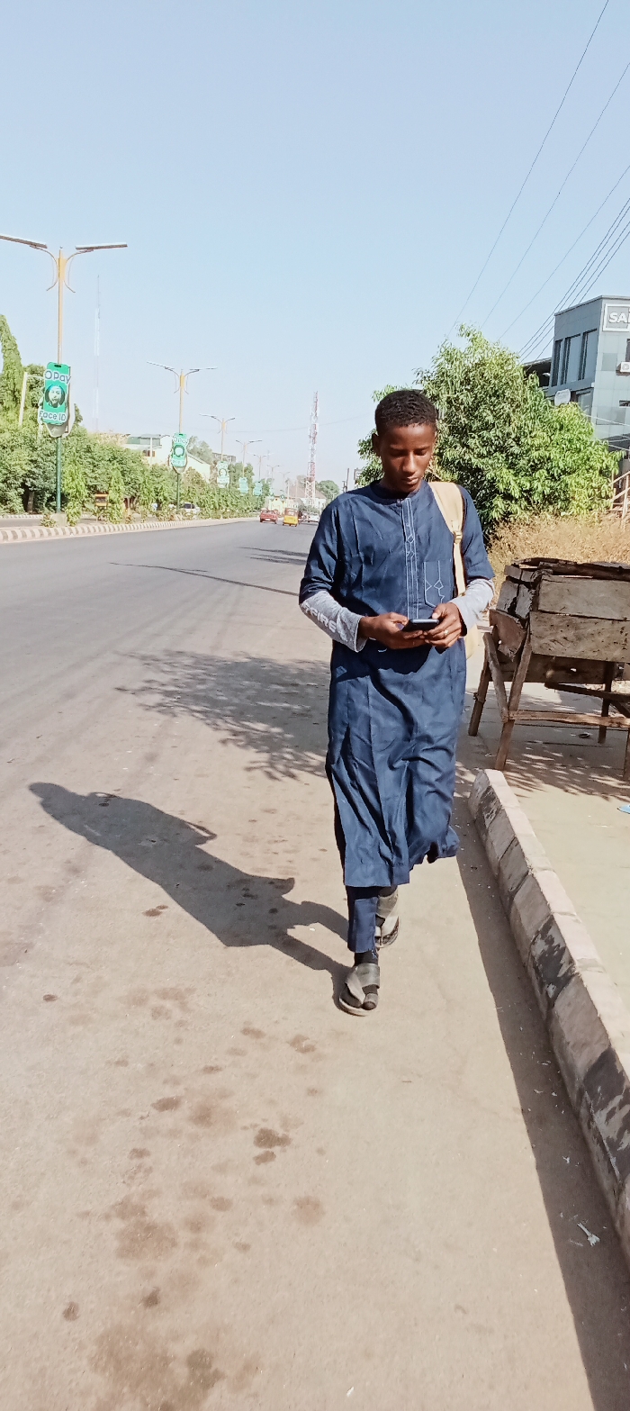- "An image taken on a clear, sunny day in Kabala, Nigeria, depicts a young male subject walking on a concrete sidewalk adjacent to a paved road" by FM-gYzzh1, licensed under CC BY 4.0