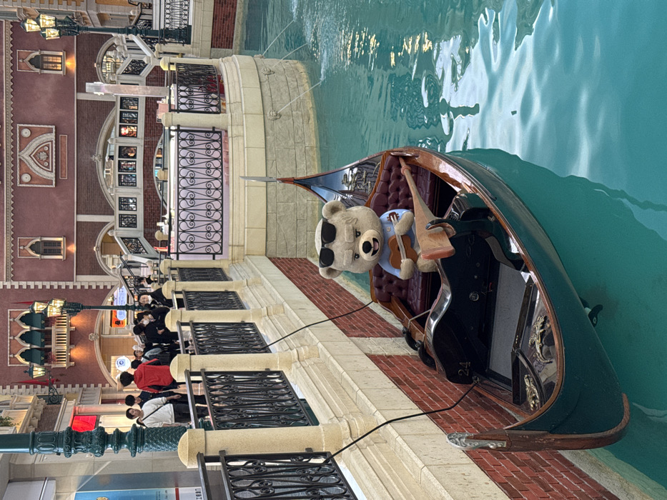 This image depicts an indoor canal scene within The Venetian Macao, Macao. In the foreground, a dark green gondola, numbered "24," floats in turquoise water alongside a brick-patterned canal wall topped by a pedestrian walkway with black wrought-iron railings and stone pillars. Seated centrally within the gondola is a large plush teddy bear wearing black sunglasses and a light blue shirt, holding a miniature ukulele. A wooden oar rests within the gondola. In the mid-ground, the canal expands, with water jets creating ripples. Buildings exhibiting Venetian architectural style, characterized by reddish-brown facades, arched windows, and balconies with intricate railings, line the canal. Ornate lampposts are positioned along the walkways. In the background, on upper-level pedestrian walkways and balconies, multiple individuals are visible. They are casually dressed; one person prominently wears a red hoodie. The environment suggests an expansive indoor complex with artificial lighting.