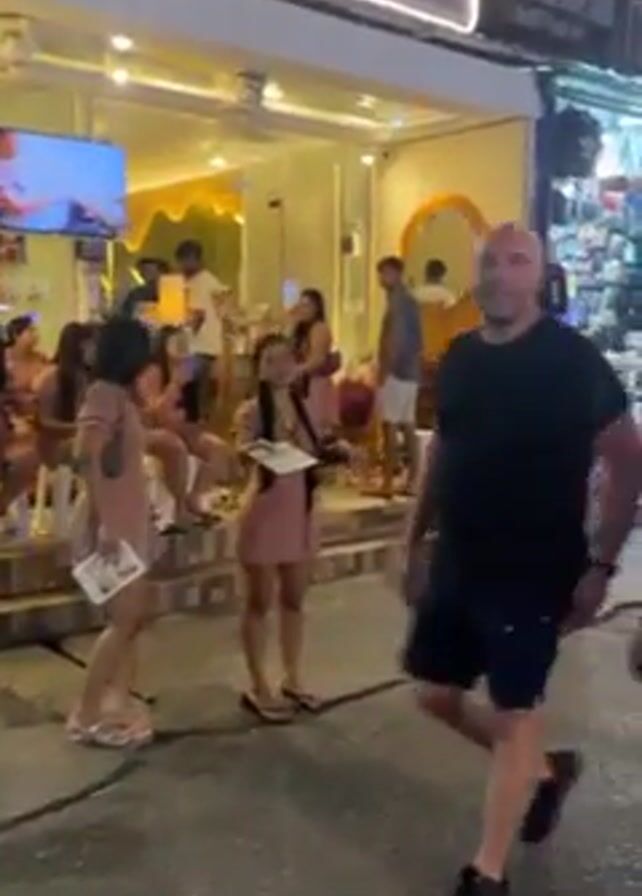 The video depicts a nighttime street scene in a commercial area, possibly in a tourist location. A massage parlor called "Hello! Massage" is visible, with several women in matching pink outfits standing in front. Some are seated, while others interact with passersby. There are several men walking on the street, and various shops with merchandise are visible in the background. The street is paved, and the area is lit with bright, colorful signs and lights. The atmosphere appears lively and bustling.