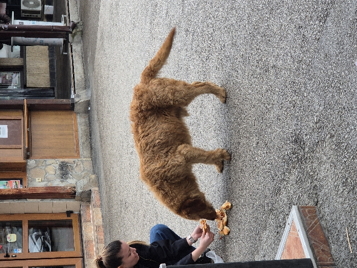 In Balgarski Izvor, Bulgaria, an outdoor scene depicts a reddish-brown, shaggy-haired dog eating food from a dark grey, speckled asphalt surface. The dog's head is lowered, actively consuming several pieces of light-colored pastry or bread. To the left, a partially visible female subject, wearing a dark top and blue jeans, is crouched. She holds additional pieces of the same food in her hands, indicating an interaction of feeding the dog. A silver watch is visible on her left wrist. The background features the exterior of a building with a light-colored stone or brick facade, brown wooden door frames, and a glass door reflecting a white vehicle. A downspout and an outdoor unit are also visible elements of the building's exterior.