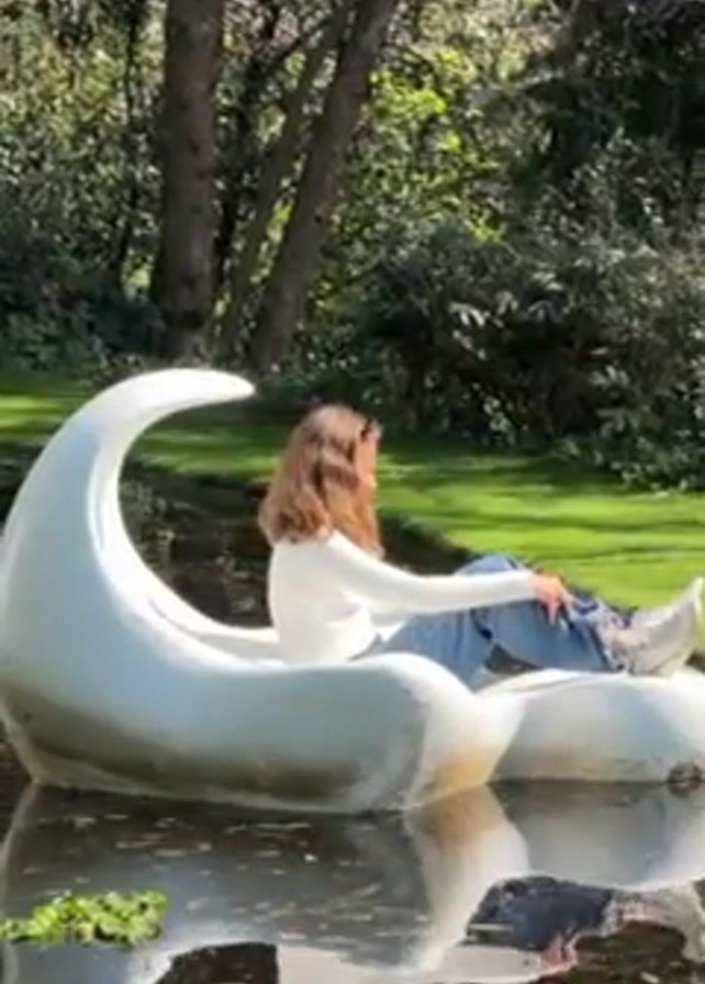 A woman sits on a white crescent-shaped structure on the edge of a pond with a grassy lawn and trees in the background