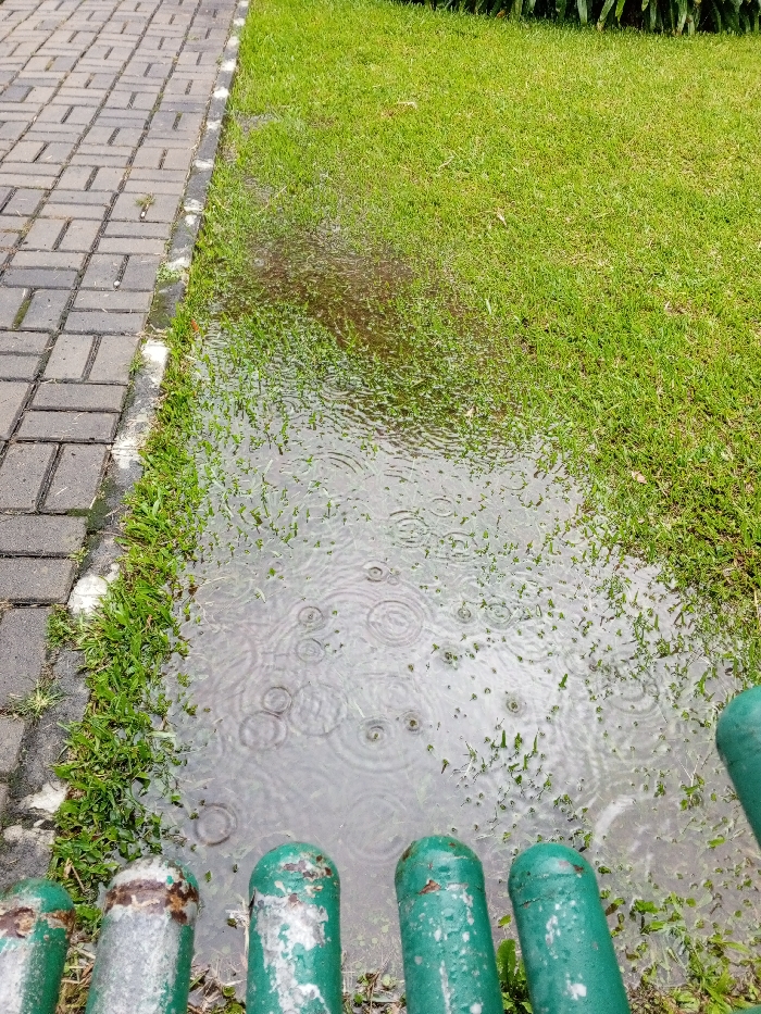 Raindrops create ripples on the surface of a puddle formed on a grass patch next to a brick walkway