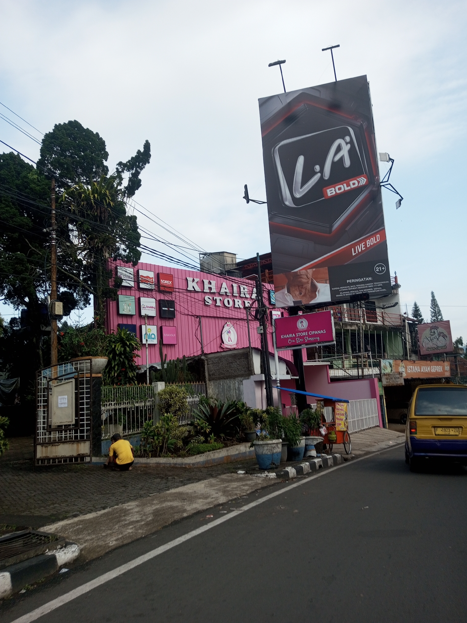 The image depicts a street scene in an urban area. A large "L.A. BOLD" billboard dominates the right side of the frame, adjacent to a three-story building. The building has a pink facade with a large sign that reads "KHAIRA STORE". Smaller signs with brand names are affixed to the pink wall. A yellow car is partially visible on the right side of the street. On the left side, a person in a yellow shirt is squatting near a gated entrance. A small cart stands between the building and the car on the right. The environment includes trees, other buildings in the background, and a street with a white dividing line.