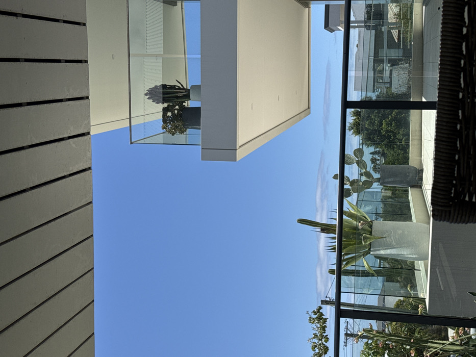 A vertically oriented shot captures a clear, blue sky framed by modern architecture. On the left, a slatted white wall adds texture. Above, a clean white structure with glass edges houses potted plants. To the right, a glass railing encloses a balcony featuring a large white planter with cacti and succulents. The scene is bright and minimalist, showcasing contemporary outdoor living against a vibrant sky.