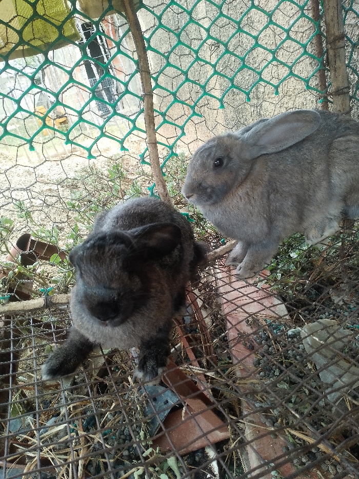 In the city of Altagracia, Venezuela, this image captures two domestic rabbits within an outdoor enclosure during daylight