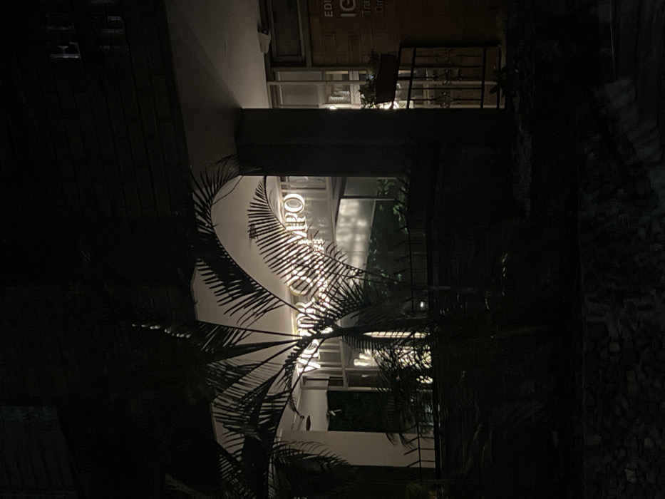 A nighttime view features a building with a brightly lit sign spelling out "EMPORIO." Palm tree leaves obscure portions of the sign. The building appears to have a balcony or terrace with some greenery. The surrounding environment is dark, with foliage adding to the shadows and indistinct details. Part of the building also features a sign displaying "EDI IG."