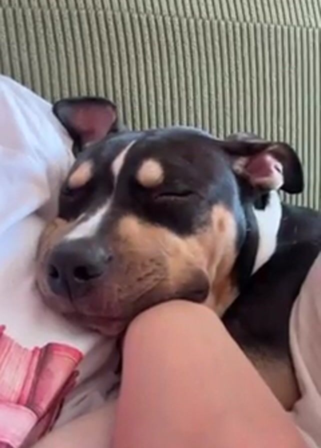close-up of a dog sleeping on a white pillow. The dog has a black, white, and tan coat and a white collar. The dog's head is resting on a person's arm, which is visible in the bottom right corner of the frame. A pink and white patterned blanket or magazine is next to the arm. The background features a green, ridged couch. The dog appears relaxed and comfortable.