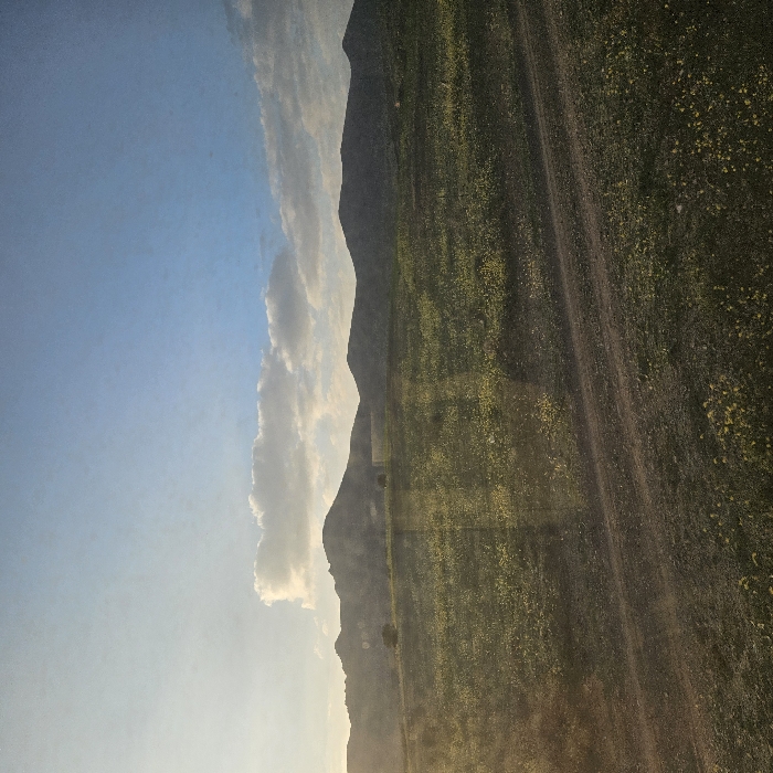 The image depicts a rural landscape in Jbilate, Morocco, under natural light conditions, likely late afternoon or early morning, indicated by long shadows. The foreground features a dirt path or track, bifurcating slightly, traversing a field of low-lying green vegetation interspersed with numerous small yellow flowers. This verdant field extends into the midground. The background is dominated by a range of dark, undulating hills or mountains. The sky above is a clear light blue, transitioning to brighter hues on the left, with scattered white and light grey clouds present, particularly in the upper left quadrant. No human figures, animals, or specific man-made structures are discernible, presenting an uninhabited natural environment.