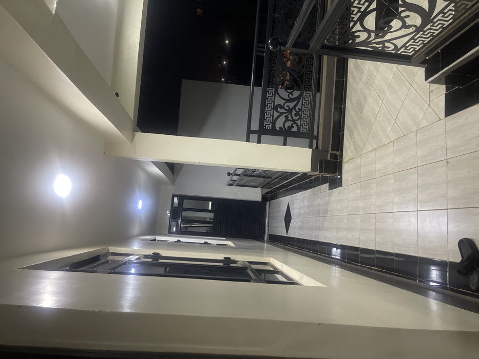 This image depicts a brightly illuminated exterior corridor or balcony area at night in Thika, Kenya