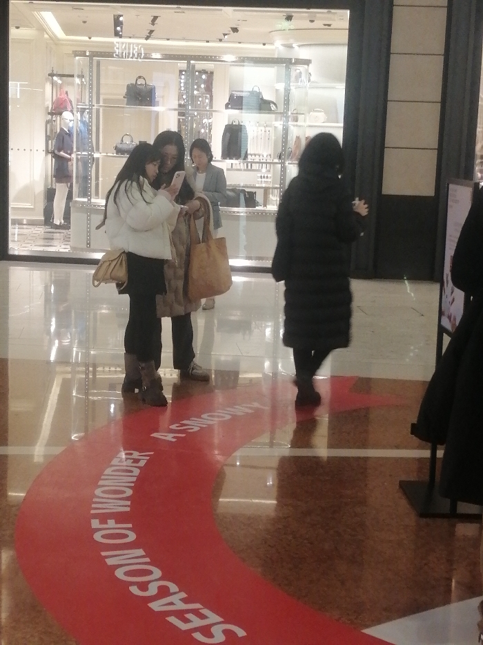 This image depicts an indoor scene within a luxury shopping mall, specifically located in Dongcheng District, China. The environment features a highly reflective, polished light brown floor with a prominent curved red path painted on it, bearing white text that reads "SEASON OF WONDER A SNOWY". Three individuals are clearly visible. In the left foreground, two East Asian women are standing. The woman on the left wears a white puffer jacket, black pants, and gray boots; a light brown shoulder bag hangs from her left shoulder. She holds a light-colored smartphone with both hands, actively viewing its screen. The woman positioned immediately to her right wears a brown fur-like coat, dark pants, and carries a large tan tote bag on her left arm. She leans slightly towards the first woman, also observing the smartphone screen. Their faces are illuminated by the phone's display, indicating a joint interaction with the device. In the mid-ground to the right, a third individual is seen from behind, walking away towards the right side of the frame. This person wears a long, dark puffer coat and dark legwear. The background consists of the glass facade of a "CELINE" retail store. Inside the store, multiple illuminated display shelves showcase various luxury handbags and accessories, including black, blue, and light-colored bags. A white mannequin dressed in dark attire is visible within the store display. Another person, possibly an employee or shopper, is partially visible inside the "CELINE" store, positioned near a display in the background right. The scene is brightly illuminated by artificial overhead lighting, casting reflections on the glossy floor. A black sign stand is partially visible on the far right edge of the frame.