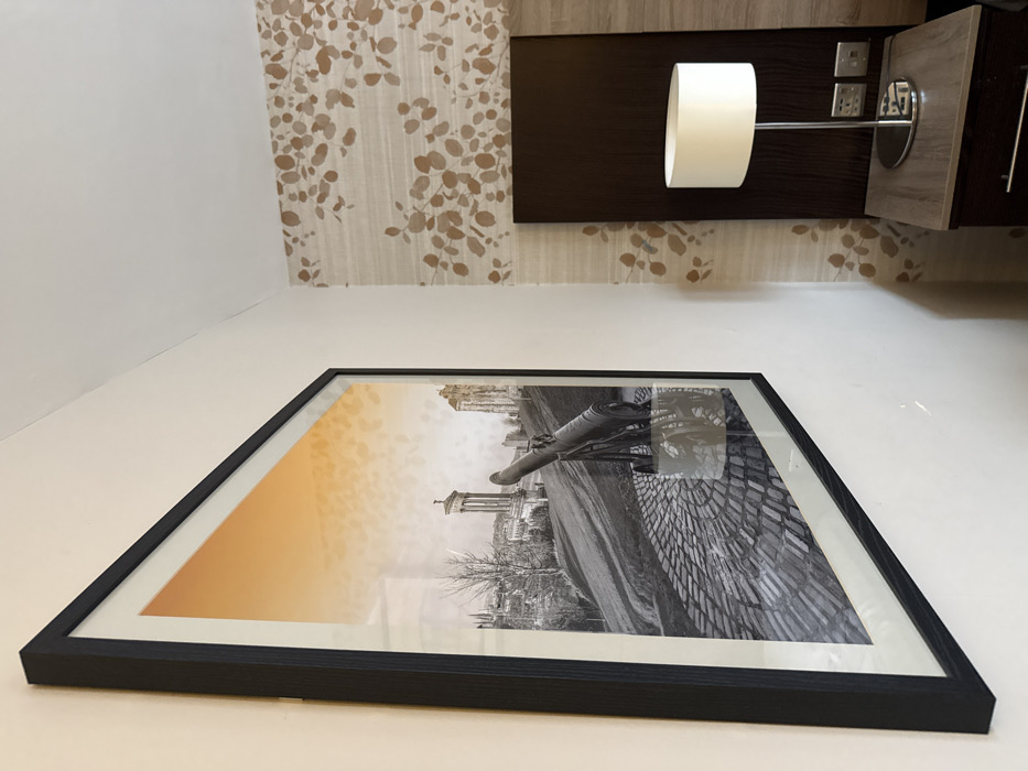 An interior scene depicts a hotel-like room with a framed artwork and a bedside arrangement. On the left, a large, rectangular framed print hangs on a light cream-painted wall. The print, encased in a thick black frame and white mat, features a black and white photograph of Calton Hill in the City of Edinburgh, United Kingdom, with a colorized, orange-toned sky displaying faded circular patterns. The photograph shows a historical cannon on a cobbled path in the foreground, with a bare-treed, grassy slope beyond it. In the background, the National Monument of Scotland is visible on the left, and the Nelson Monument tower on the right. To the right of the framed print, the wall is covered in light beige wallpaper with a repeating pattern of brown leaf-like shapes. A dark brown, vertically textured panel, likely a headboard, is positioned against this wallpaper. A light brown wooden bedside table with two dark brown drawers and silver handles stands in front of the panel. On the table, a modern lamp with a cylindrical white fabric shade, a thin silver stem, and a round silver base is present. Above the table, two UK double power sockets and two USB charging ports are installed on the wall. No individuals are visible.