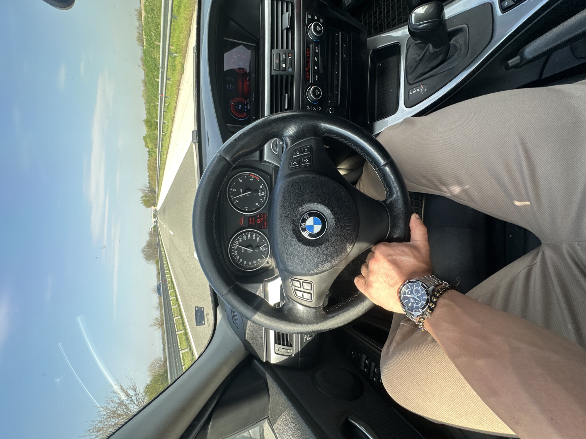 interior of a BMW car from the driver's perspective, presumably taken while driving