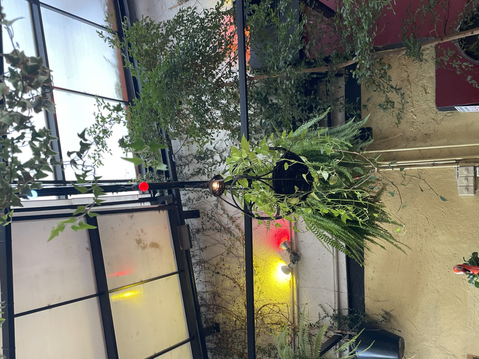 Captured from a low angle, the image reveals a vibrant indoor garden. Green foliage cascades from hanging baskets, creating a lush canopy. A network of black metal framework supports the greenery. Illuminated panels diffuse light, casting colorful hues on the surrounding surfaces. Wall-mounted electrical outlets and pipes add a touch of industrial charm to the verdant scene.