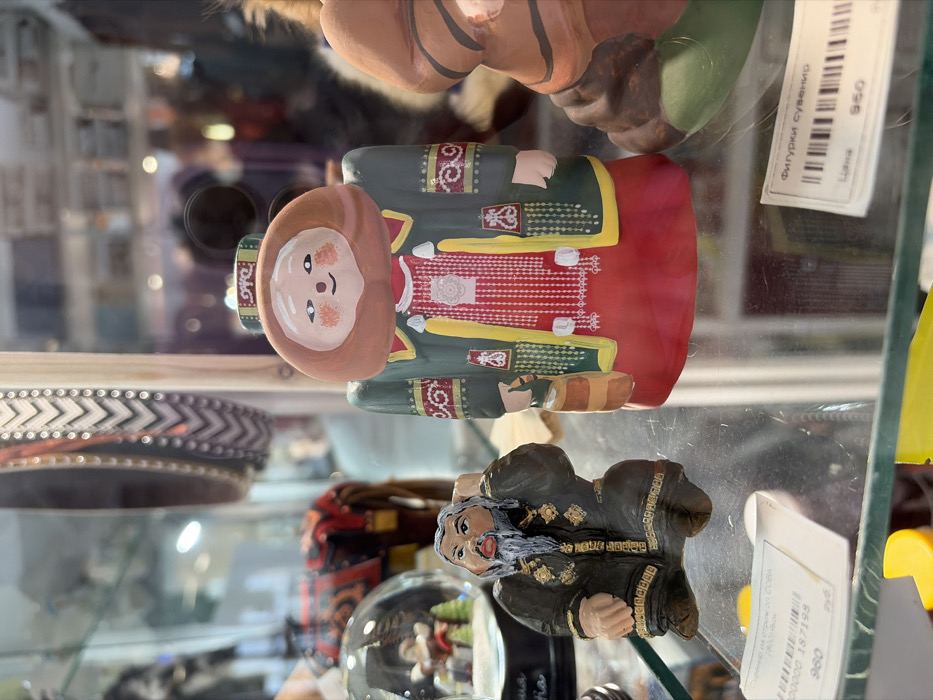 On a glass shelf, there are several decorative figurines. A figure of a man with a red skirt, green jacket, and a light brown face stands out. Beside it, a figure of an old man with grey hair and beard, wearing a dark jacket, is noticeable. In the background, there are other figurines and trinkets, including a snow globe. The scene is brightly lit, and reflections are visible on the glass surface. A price tag is attached to one of the items.