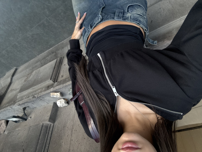 A close-up, chest-down photograph depicts an individual standing outdoors in Yerevan, Armenia, next to a building facade constructed from dark, carved tuff stone. The person has long, dark hair and is dressed in a black, long-sleeved, cropped hoodie with a partially unzipped silver zipper, revealing a black top underneath. A silver chain necklace is visible. They wear light blue, low-rise denim jeans, exposing a section of the abdomen. A dark red or burgundy shoulder bag strap is visible over the right shoulder. The individual's left hand, adorned with rings and light pink manicured nails with white tips, rests against their hip on the jeans. The lips are visible at the top of the frame, appearing full with a light pink hue. The background features a multi-tiered stone wall or building base with decorative carvings. On a prominent ledge to the right, two small, light-colored, irregularly shaped rocks are present, along with a dark, rectangular fixture mounted to the wall. The ground is paved with dark grey square tiles.