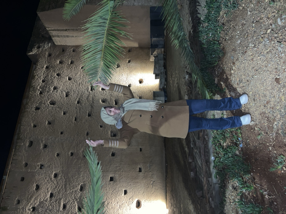 A woman stands with arms raised near a large, old stone wall with many small, dark holes. She wears a tan coat, blue jeans, white shoes, and a head covering with a light scarf. A tall palm tree with broad leaves grows nearby. The ground is dirt and gravel with some green foliage. The lighting is dim with artificial light illuminating parts of the wall and ground.