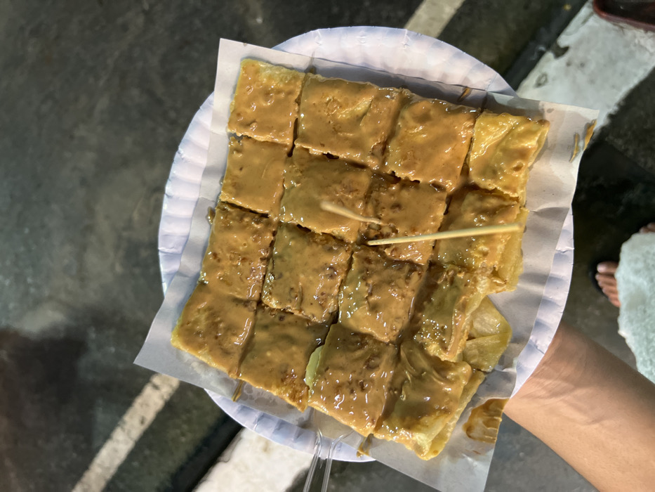 A human hand holds a circular white paper plate containing a Thai Roti, cut into 16 square pieces arranged in a 4x4 grid. Each piece is covered with a viscous, light brown topping, likely a sweetened condensed milk or peanut butter sauce, featuring darker particulates. A thin wooden skewer is inserted into one piece, and a clear plastic fork is partially visible on the left. The plate is lined with white parchment paper. Below the hand, bare feet are visible, with a white textile partially covering the left foot. The background consists of a dark asphalt or concrete surface with a distinct white painted line, indicating an outdoor street or market environment at night in Patong, Thailand.