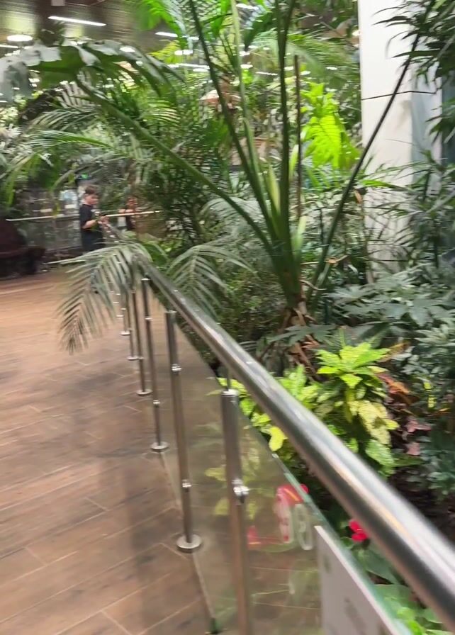 The camera travels along a hallway enclosed by a glass and metal railing, revealing a lush indoor botanical garden