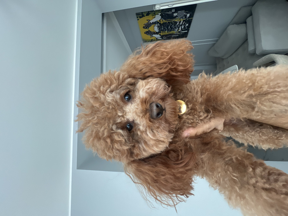 A reddish-brown poodle-type dog is the central subject, presented in a close-up, eye-level shot