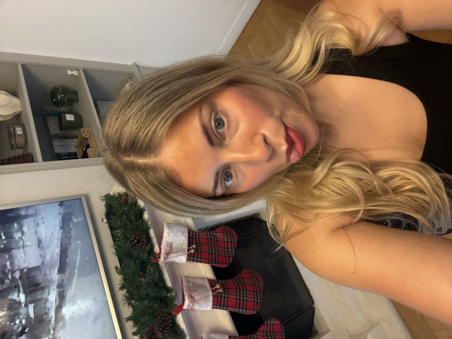 The image displays an indoor scene located in Rueil-Malmaison, France. A blonde woman with blue eyes, wearing a black tank top, is centered in the foreground, facing the camera with her tongue slightly extended. Behind her, a white fireplace mantel is decorated with a green garland containing pinecones. Three red and white plaid Christmas stockings, each adorned with small bells, hang from the mantel. Above the mantel, a television screen is visible, displaying an image that appears to be a blurry, snowy outdoor landscape. To the right of the woman, a light gray built-in shelving unit is present, holding various objects including books, a woven basket, a candle in a jar, and several decorative items of white and dark green colors. The room features light-colored walls and what appears to be wood flooring in the lower right portion of the frame.