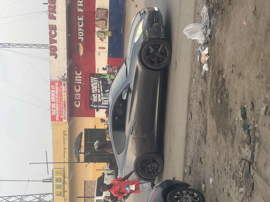 A gray Hyundai Genesis Coupe sits on a dirt road. A man in a red shirt stands near the car. Trash litters the roadside. In the background, a building is adorned with advertisements for "JOYCE FR" and "C&C INC. BRANCH #1," which distributes 6S PLUS BREWERIES INC. There's also a "BIG DADDY" visual/energy mix advertisement. The overall setting is a commercial street in an urban area.